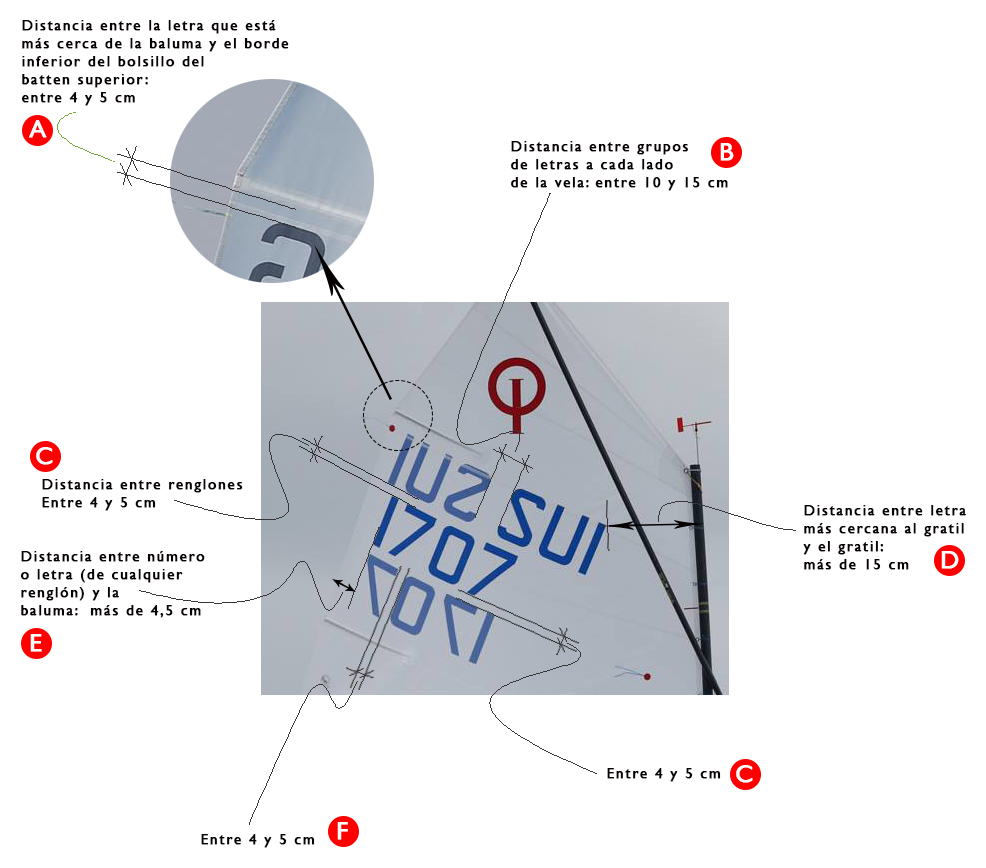 - La distancia entre la letra que está más cerca de la baluma y el borde inferior del bolsillo del batten superior debe ser entre 4 y 5 cm (letra A)