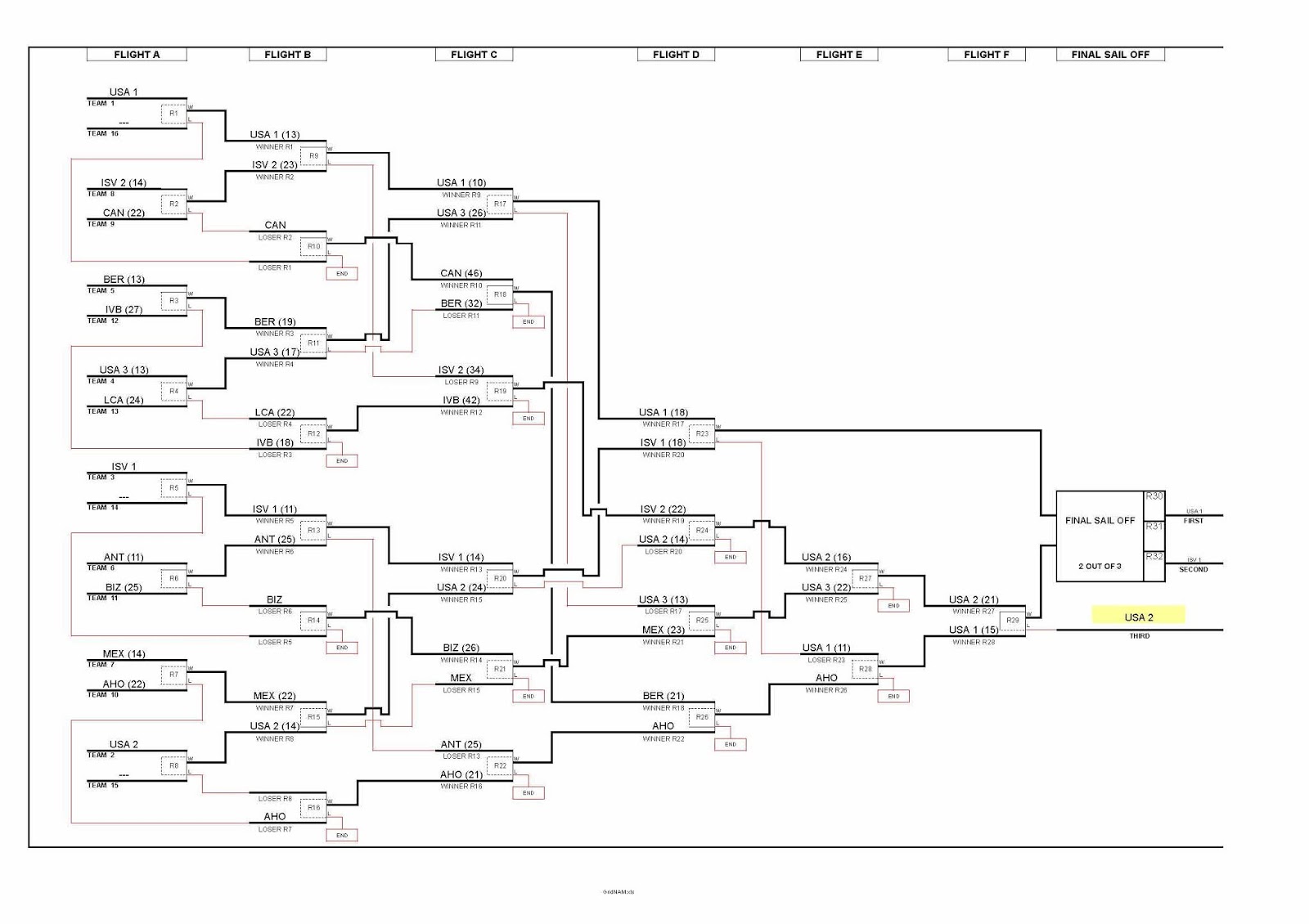 En el ejemplo de la imagen, de los 16 equipos que podrían haber participado hubo sólo 13, por lo que en la primera ronda los tres mejores equipos no corrieron ninguna regata (el team 16, el team 15 y el team 14 están vacíos) y pasaron a la segunda como ganadores. USA 1 avanza “por arriba” sin perder ninguna regata y llega a la final, mientras que ISV 1 pierde una regata y debe ir por abajo, correr más regatas y llegar a la final.