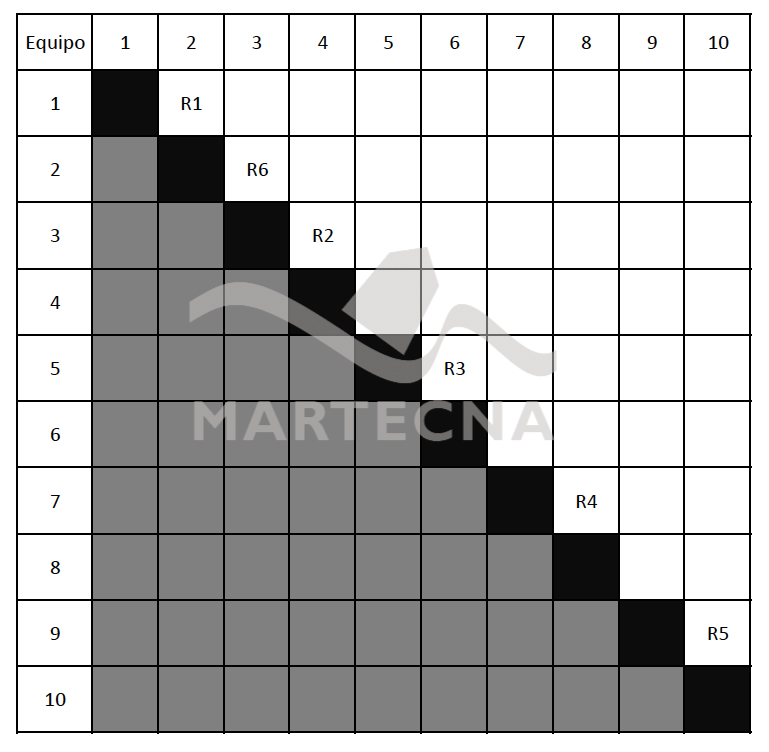 Si no hay muchos equipos, se busca que cada equipo compita por lo menos una vez contra cada uno de sus rivales. La cantidad de regatas a organizar para conseguir ese objetivo es n . (n-1)/2, donde n es la cantidad de equipos. Por ejemplo, si hay 10 equipos se harán 10 x 9/2 = 45 regatas.